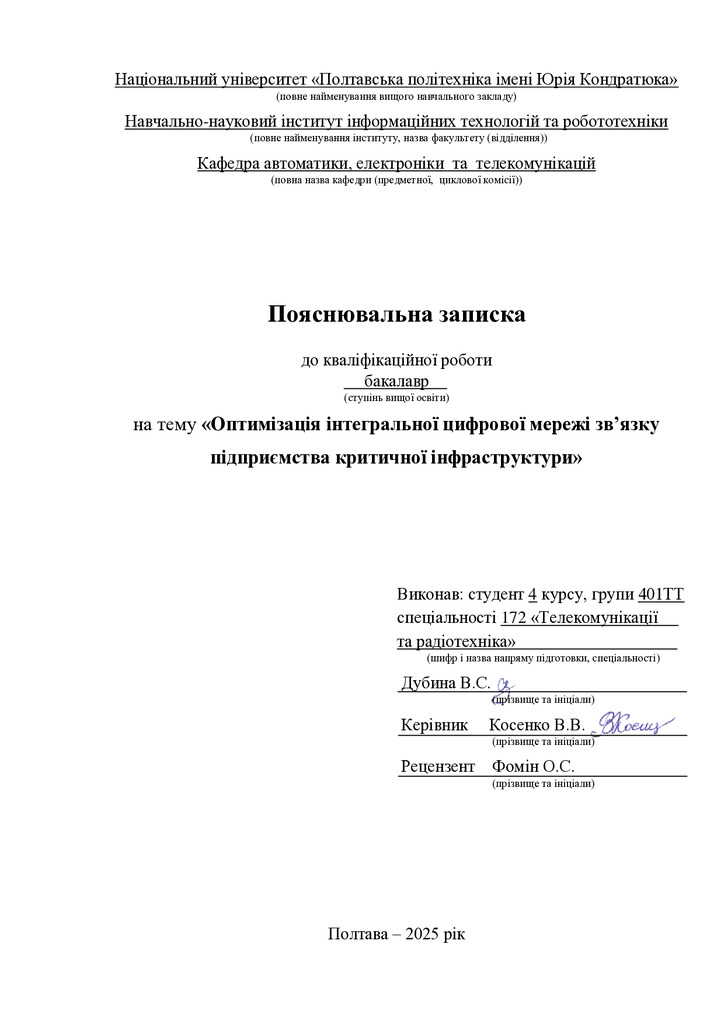 Оптимізація інтегральної цифрової мережі зв’язку підприємства критичної інфраструктури